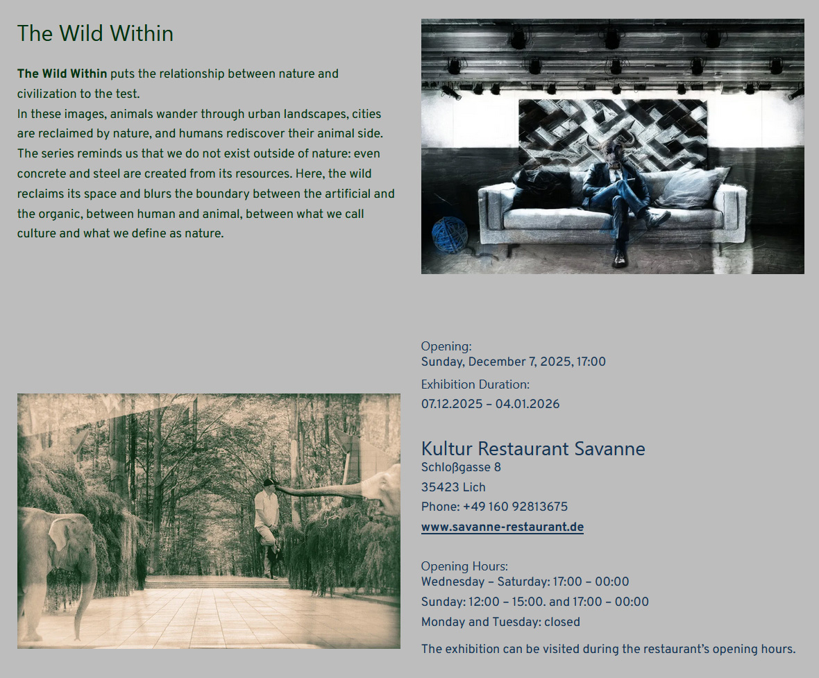 Die Ausstellung ist vom 8.8. bis 5.9.2020 w?hrend der Savanne-Gesch?ftszeiten ge?ffnet. Dienstag bis Sonntag 17:00 bis 24:00 Uhr.