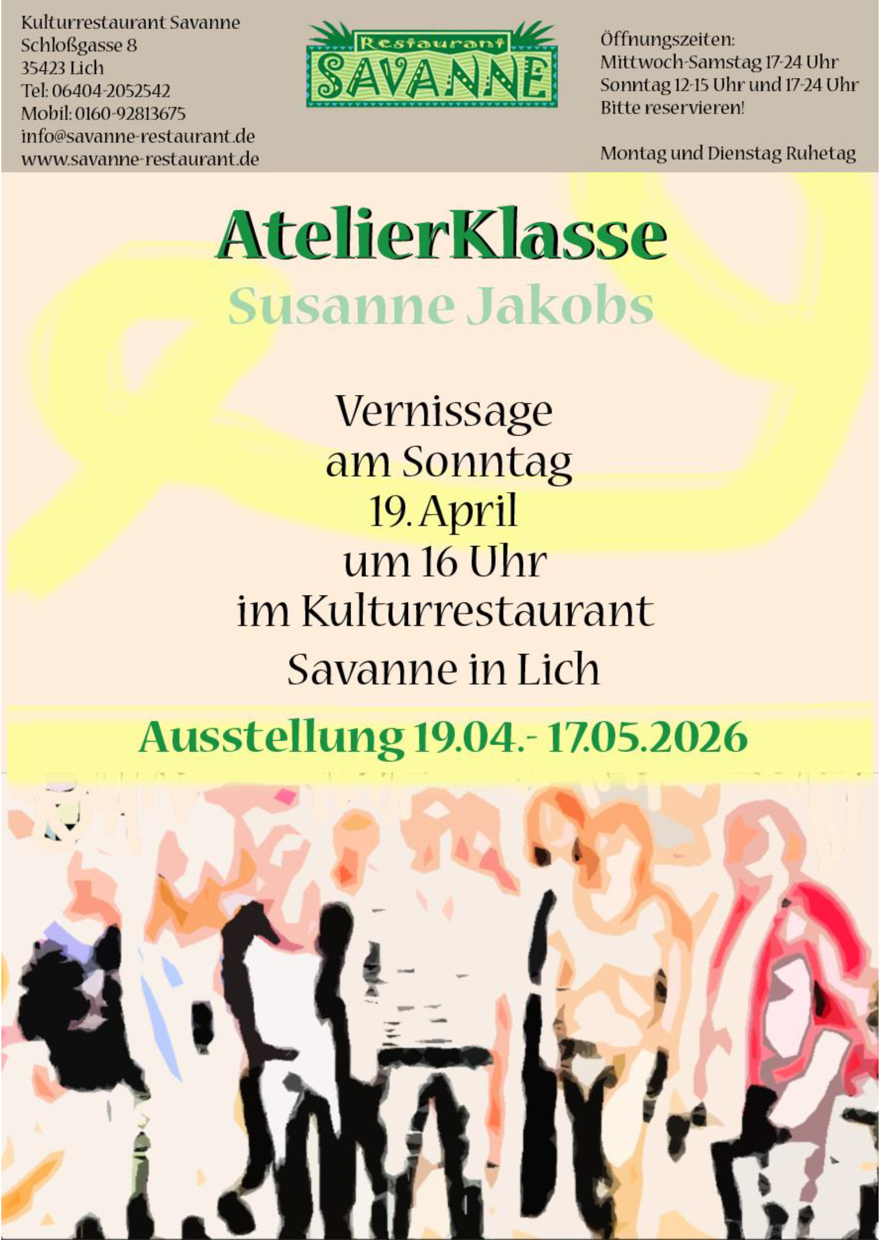 Die Ausstellung ist vom 8.8. bis 5.9.2020 w?hrend der Savanne-Gesch?ftszeiten ge?ffnet. Dienstag bis Sonntag 17:00 bis 24:00 Uhr.