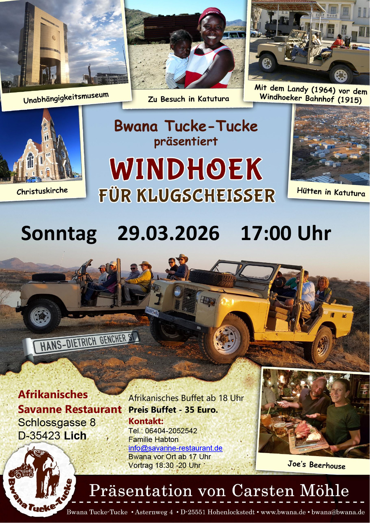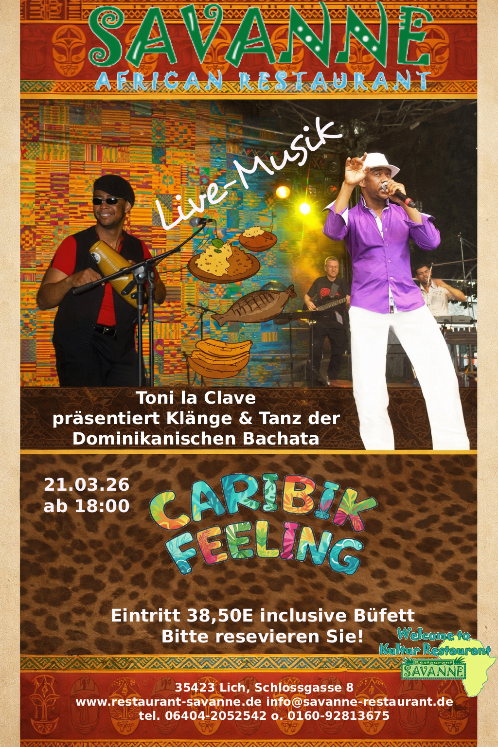 Afrikanisches Savanne Restaurant Schlossgasse 8, D-35423 Lich Tel.: 06404-2052542 Herr Habton 18:30 - 20 Uhr Vortrag, dabei lekker afrikanisch essen Buffet für 35 Euro ab 18 Uhr. Bwana vor Ort ab 17:00 Uhr.